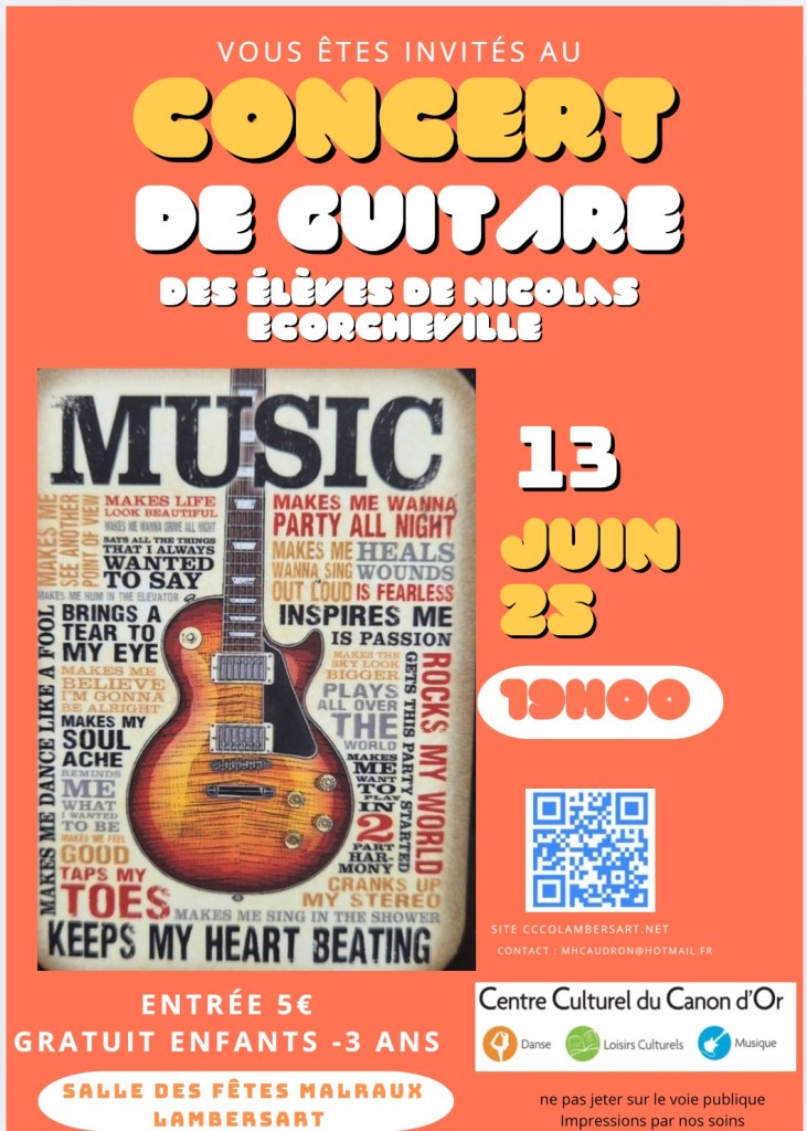🎸 Guitare Concert de Guitare le 13 juin 25 à 19h salle Malraux 🎸 Publié le 20 Mai 2025 par cccolambersart Partager : Partager sur X(ouvre dans une nouvelle fenêtre) X Partager sur Facebook(ouvre dans une nouvelle fenêtre) Facebook J’aime chargement… Similaire